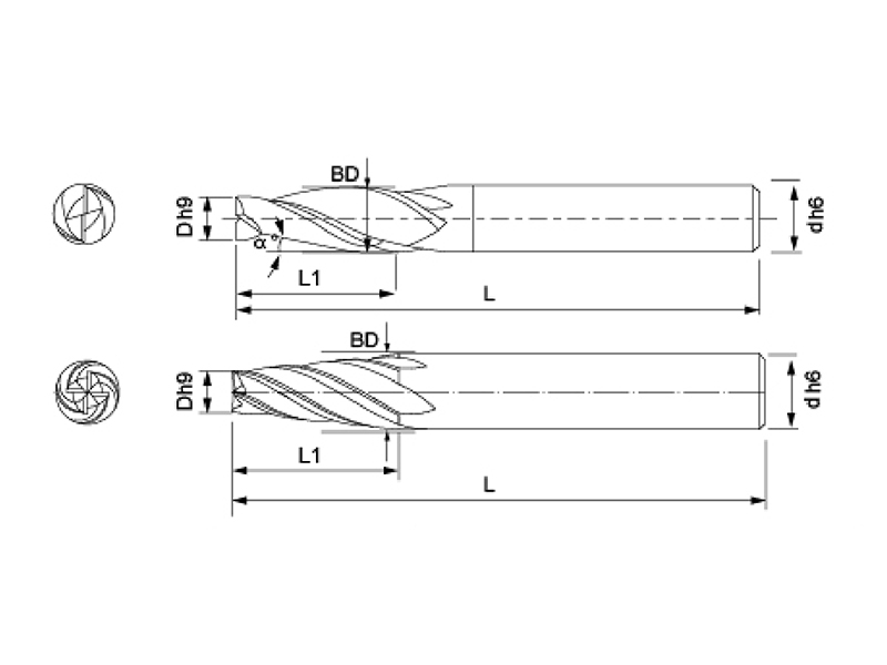 | 產(chǎn)品編號 ltem code | 先端徑(D h9) | 斜度(α°) | 刃長(L1) | 粗端徑(BD) | 柄徑(d h6) | 全長(L) |